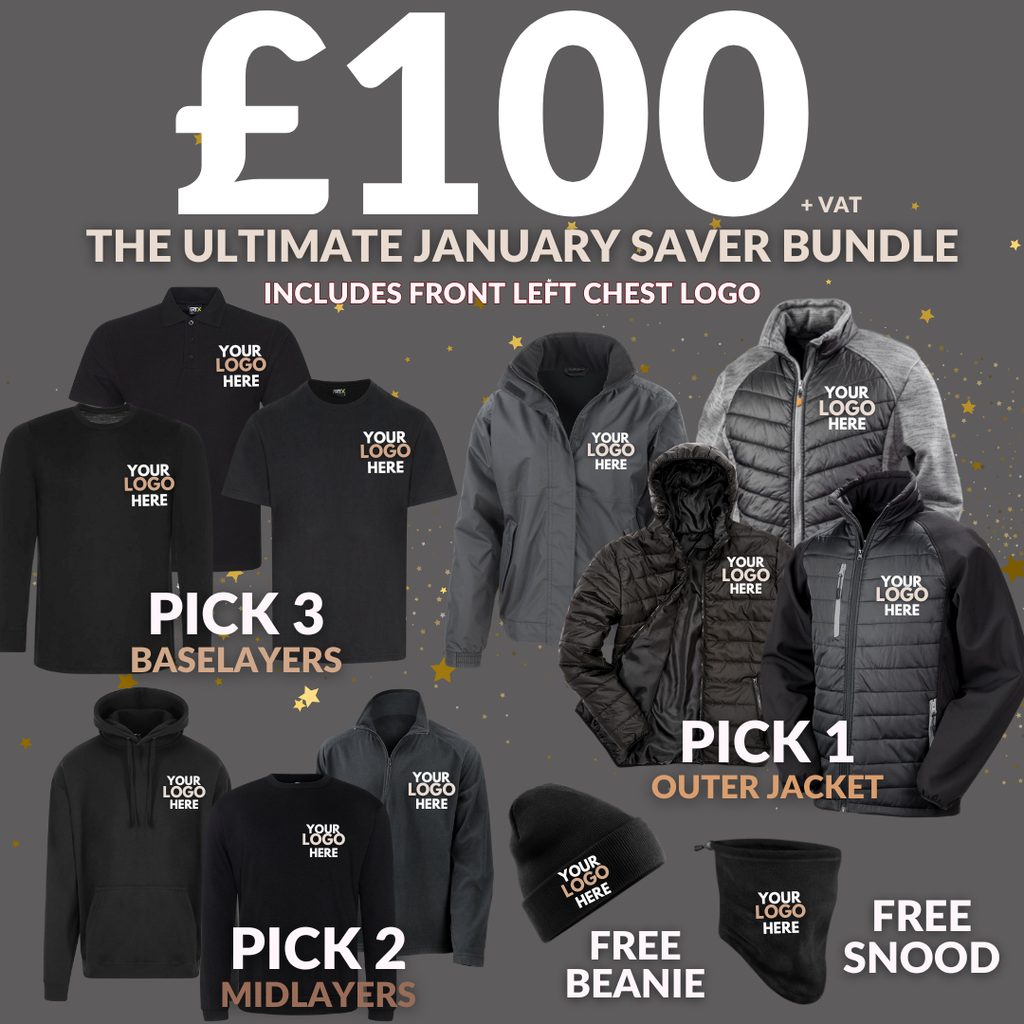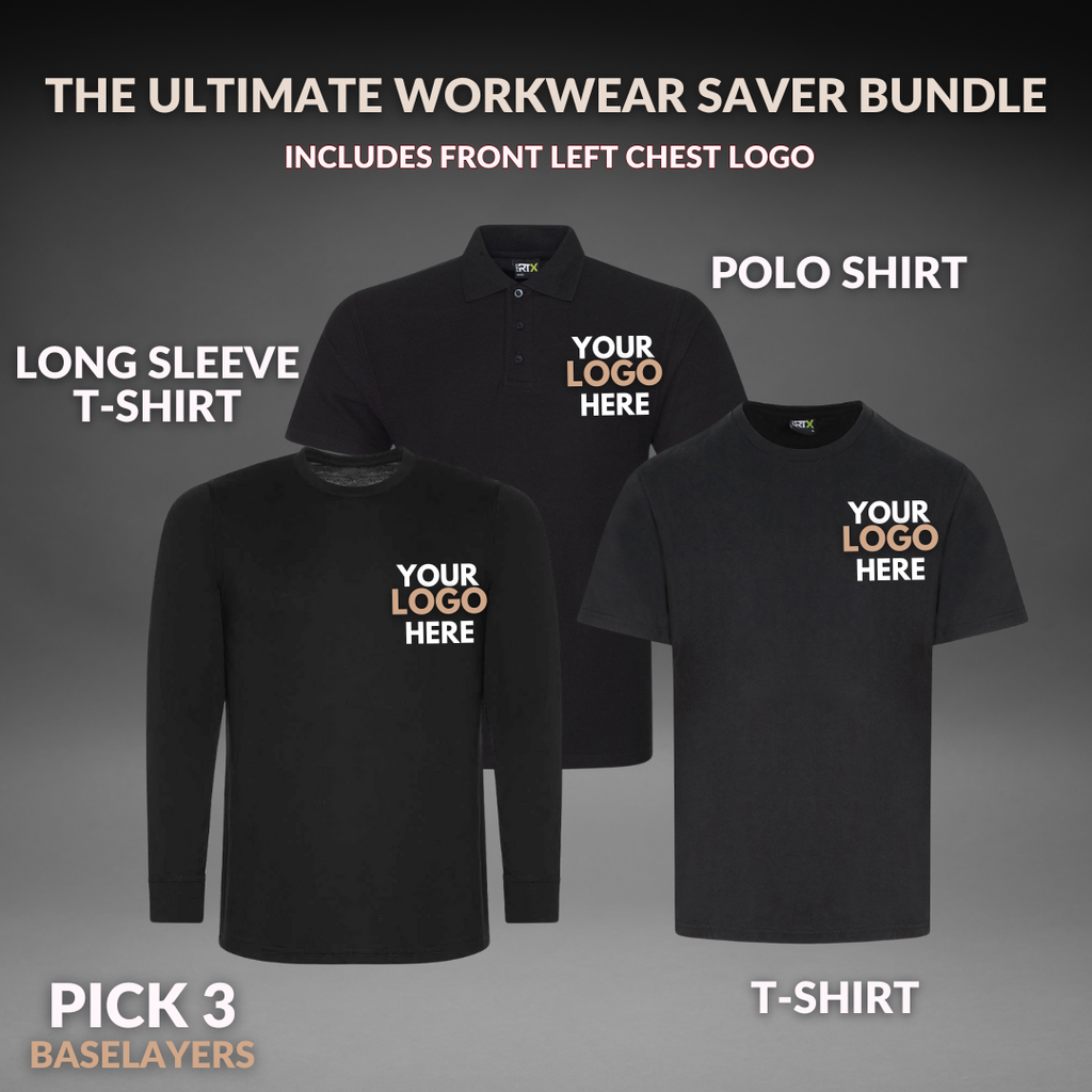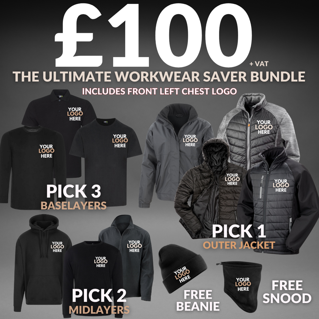 Front logo embroidery is included in the bundle price – no hidden setup fees.